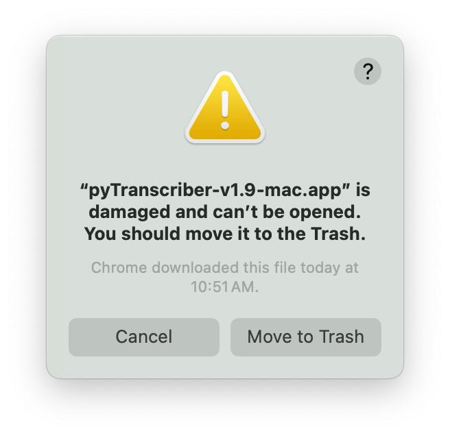 "pyTranscriber-v1.9-mac.app" is damaged and can't be opened. You should move it to the Trash.