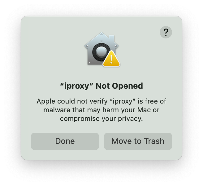 Apple could not verify "iproxy" is free of malware that may harm your Mac or compromise your privacy.